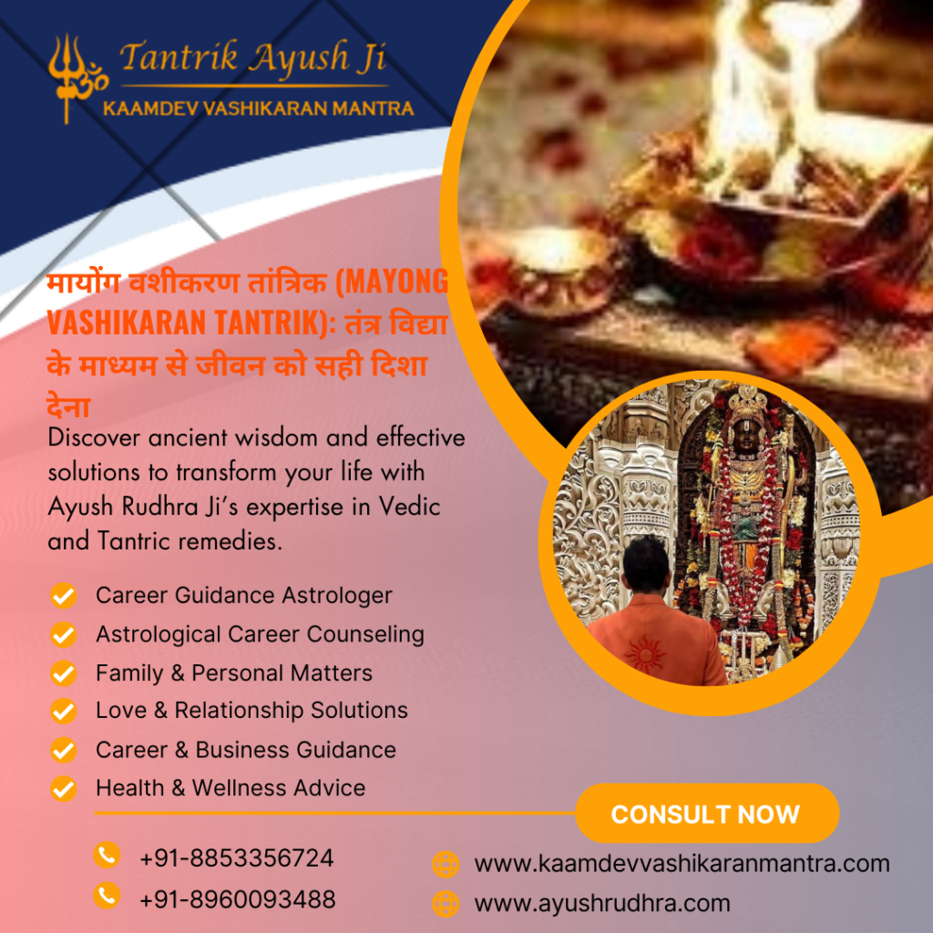अगर आप भी अपने जीवन में किसी समस्या का समाधान वशीकरण तंत्र के माध्यम से प्राप्त करना चाहते हैं, तो आपको एक सक्षम और सिद्ध वशीकरण तांत्रिक से संपर्क करना होगा। तांत्रिक आयुष रुद्र जी, जो मायोंग तंत्र विद्या में दक्ष हैं, आपके जीवन को सकारात्मक दिशा देने के लिए तैयार हैं। वे तंत्र और मंत्रों के माध्यम से आपकी समस्याओं का समाधान कर सकते हैं।