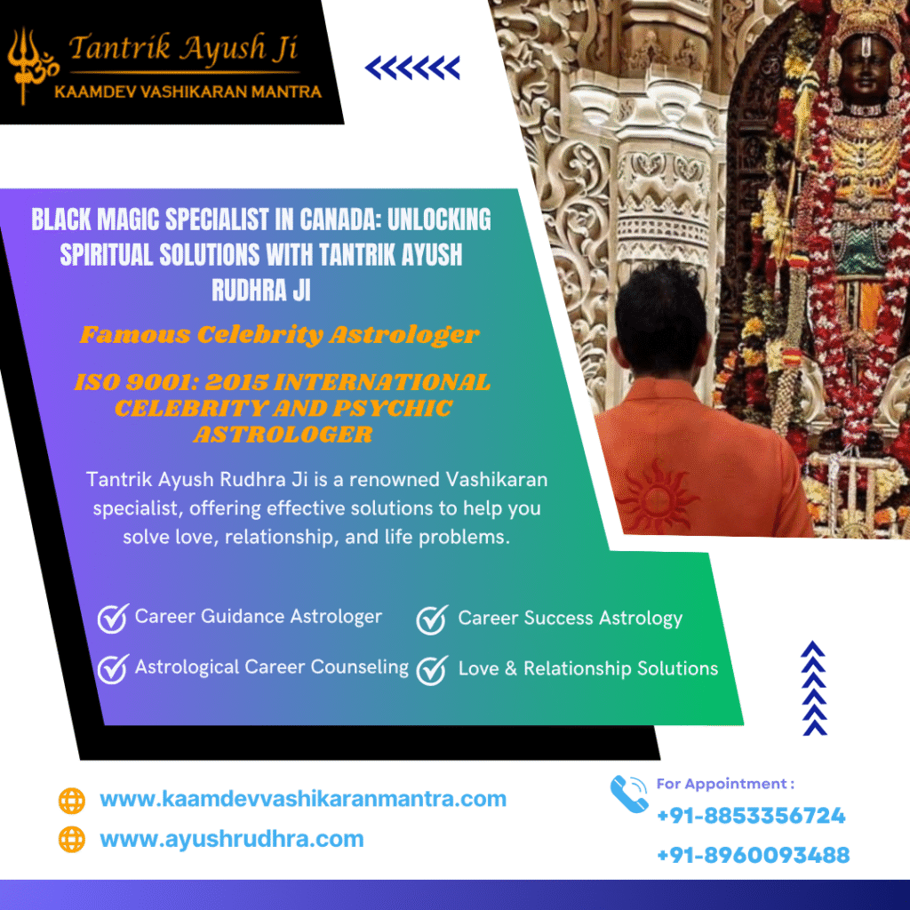 Tantrik Ayush Rudhra Ji is a renowned black magic specialist in Canada, known for his deep understanding of occult sciences and his ability to remove harmful energies from individuals’ lives. His expertise in Vashikaran, Tantric rituals, and the ancient sciences of astrology allows him to address complex issues related to black magic, curses, and negative energies. He offers solutions to clients worldwide, using his knowledge to restore peace, prosperity, and happiness.